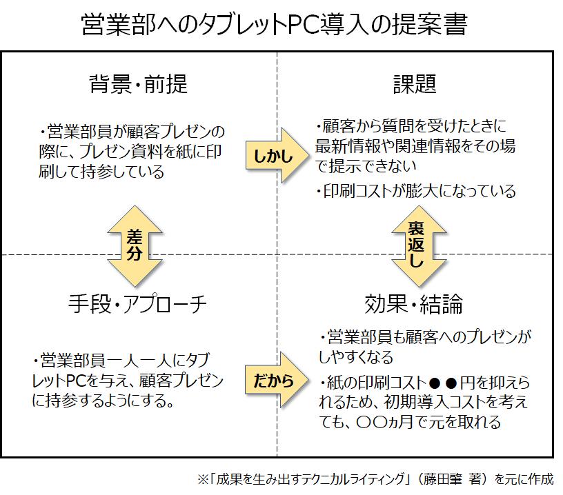 つまり読み手の上司に、現状の課題とタブレットPC導入という打ち手の間の、論理的なつながりを理解してもらえない限り、ビジネス文書の目的を果たせないのです。