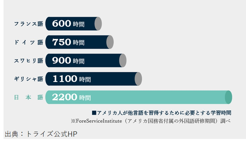 アメリカ国務省付属機関FSIの調査では、英語話者が日本語を習得するためには2,200時間が必要とされています。同様に日本語話者(日本人)が英語を習得するにも2,200時間が必要だと考えられます。