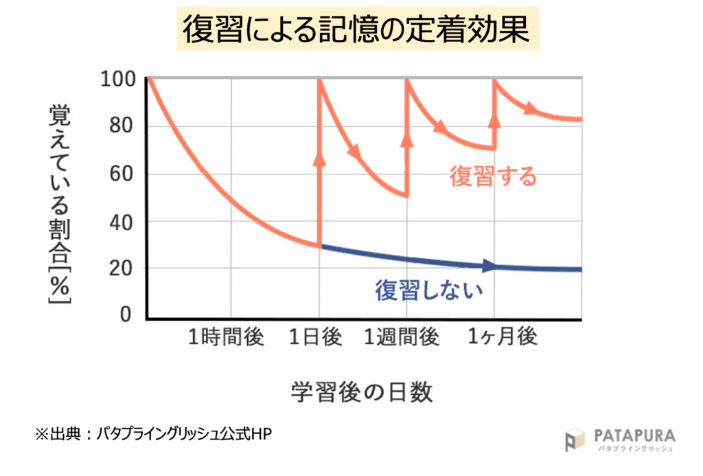 とはいえ、毎日復習すれば良いわけではありません。1日後、1週間後、1ヶ月後など適切なタイミングで復習するのが大事なんです。