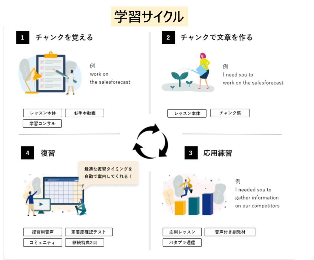 瞬間英作文も良いトレーニングですが、日本語を英語に訳すので、その習慣が残ってしまい、実践の場でも訳す作業を入れてしまうために英語を話すまでに時間がかかってしまいがち。パタプラは英語のまま表現を学ぶので英語の思考回路が身につきやすいです。