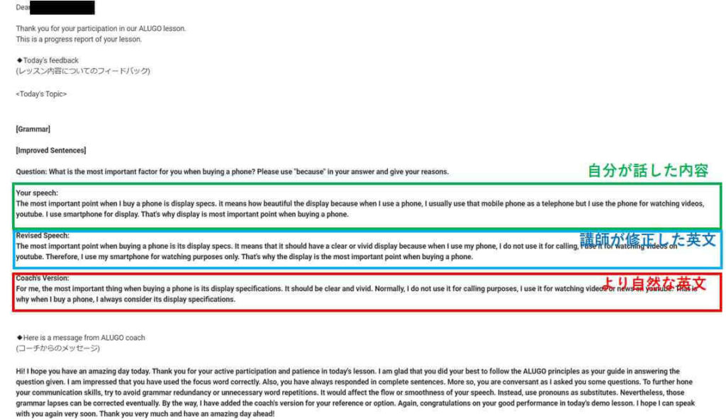 レッスンで添削してくれた英文に加え、「より自然な英語表現にするには、このように話すとよいよ」との案文が送られてきます。