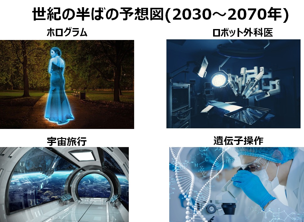 21世紀半ばになると、SFの世界に近づきます。ホログラム、ロボット外科医、デザイナー・チャイルド(遺伝子操作された赤ちゃん)、宇宙旅行などが予測されています。映画「マイノリティ・リポート」に描かれる世界をイメージすると近いかもしれません。