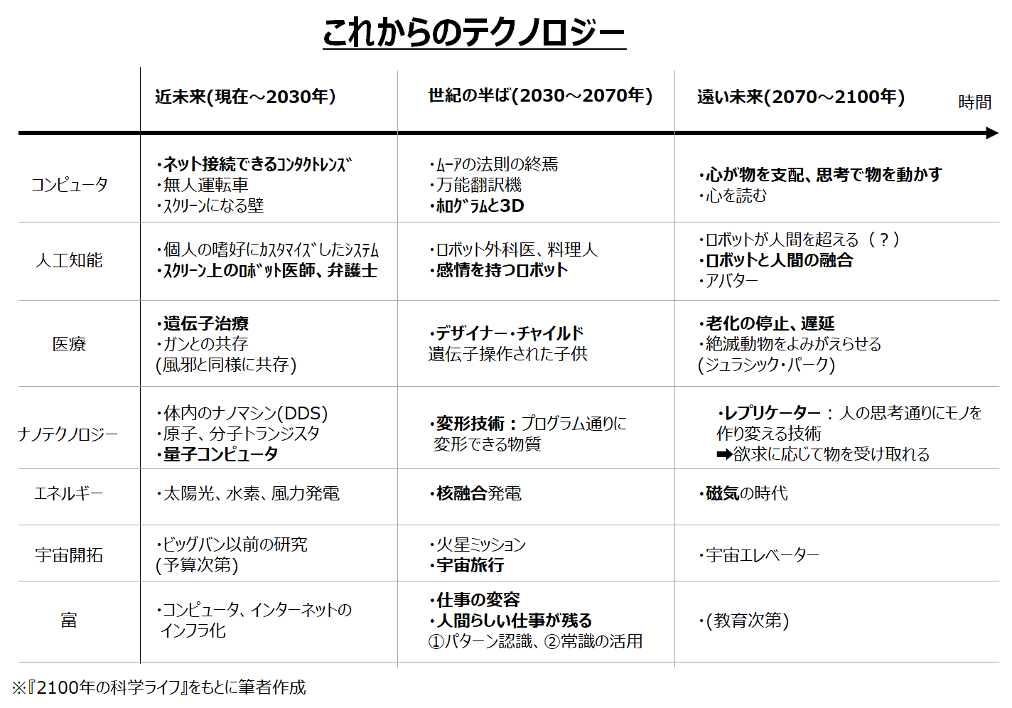 これらの観点から、現時点でも最も良い技術の未来予測として『2100年の科学ライフ』を参考にしました。