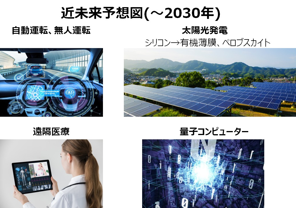 2030年までに自動運転、無人運転、太陽光などのエコな発電システム、遠隔医療、量子コンピューターなどが実現されると予測されています。
