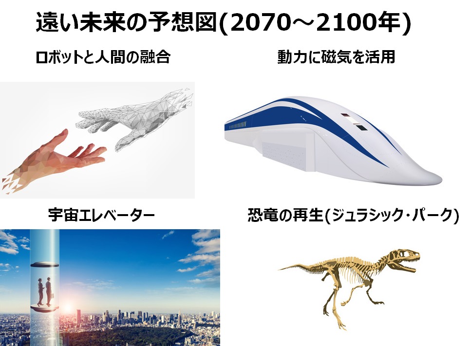 他にも、宇宙エレベーター(地表から宇宙空間までエレベーターで移動可能)や、発電が不要になる磁気技術などが実現されると予測されています。