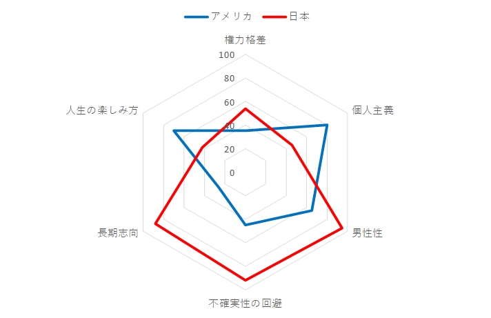 ここまで、ホフステードの異文化理解の指標をもとにアメリカ文化と日本文化を比較してきました。