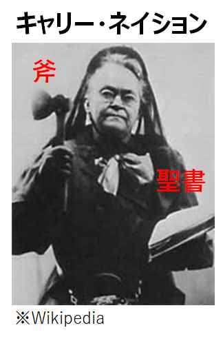 キャリー・ネイションは女性を集めて、「キャリー・ネイション禁酒法グループ」を作り、酒場(サルーン)に入り、アルコール販売をやめるように訴えました。ときには、酒のボトルを斧でたたき割る儀式を実行していたそうです。