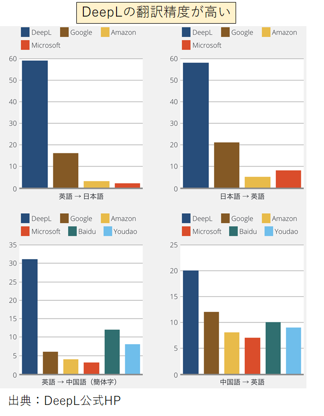 下の図のように、英語→日本語、日本語→英語などの翻訳において、DeepLはGoogle翻訳など他の翻訳ツールより高い精度を誇ります。