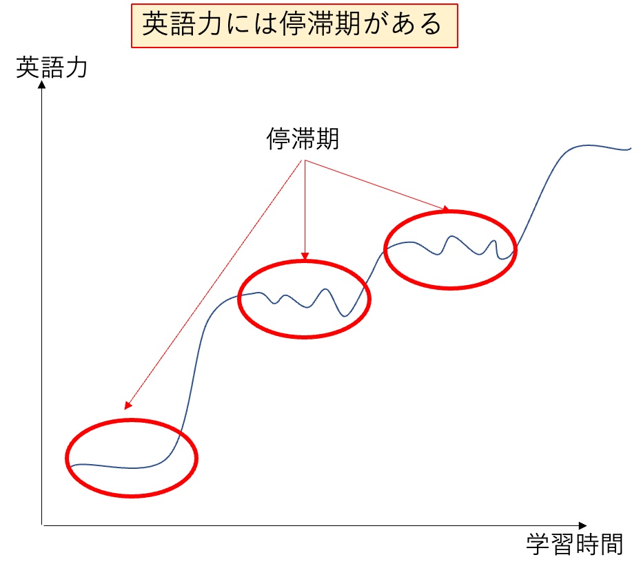英語力の伸びは一直線ではなく、停滞期と成長期の波があります。