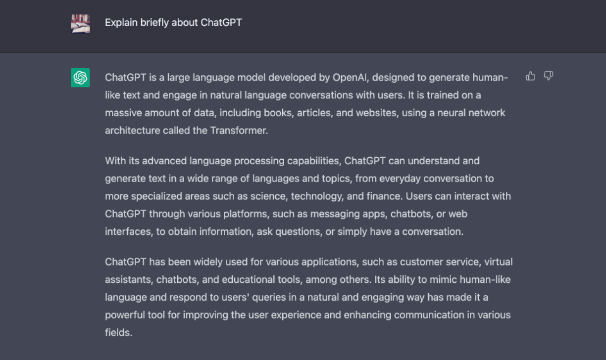 たとえば、ChatGPTを使って「ChatGPTについて簡単に説明して」と質問した際の回答を紹介します。