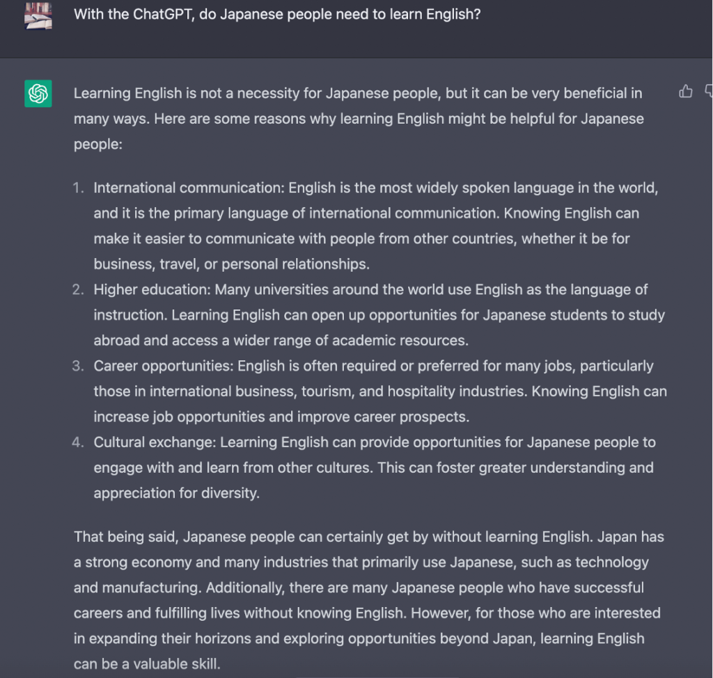 ためしにChatGPTに「ChatGPTがあれば、日本人に英語学習は不要ですか?」と質問してみました。
