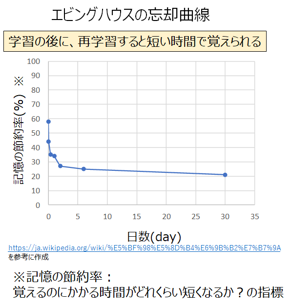上の図を見ると、1日後には34%程度しか覚えていないことがわかります。つまり3分の2の内容は1日で忘れてしまうわけです。