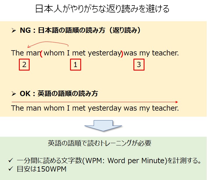 一見当たり前に聞こえますが、多くの日本人は英語を読むとき「返り読み」をしてしまいがちです。返り読みとは、英文法を解釈しながら読む方法で、「日本語の語順」の読み方です。