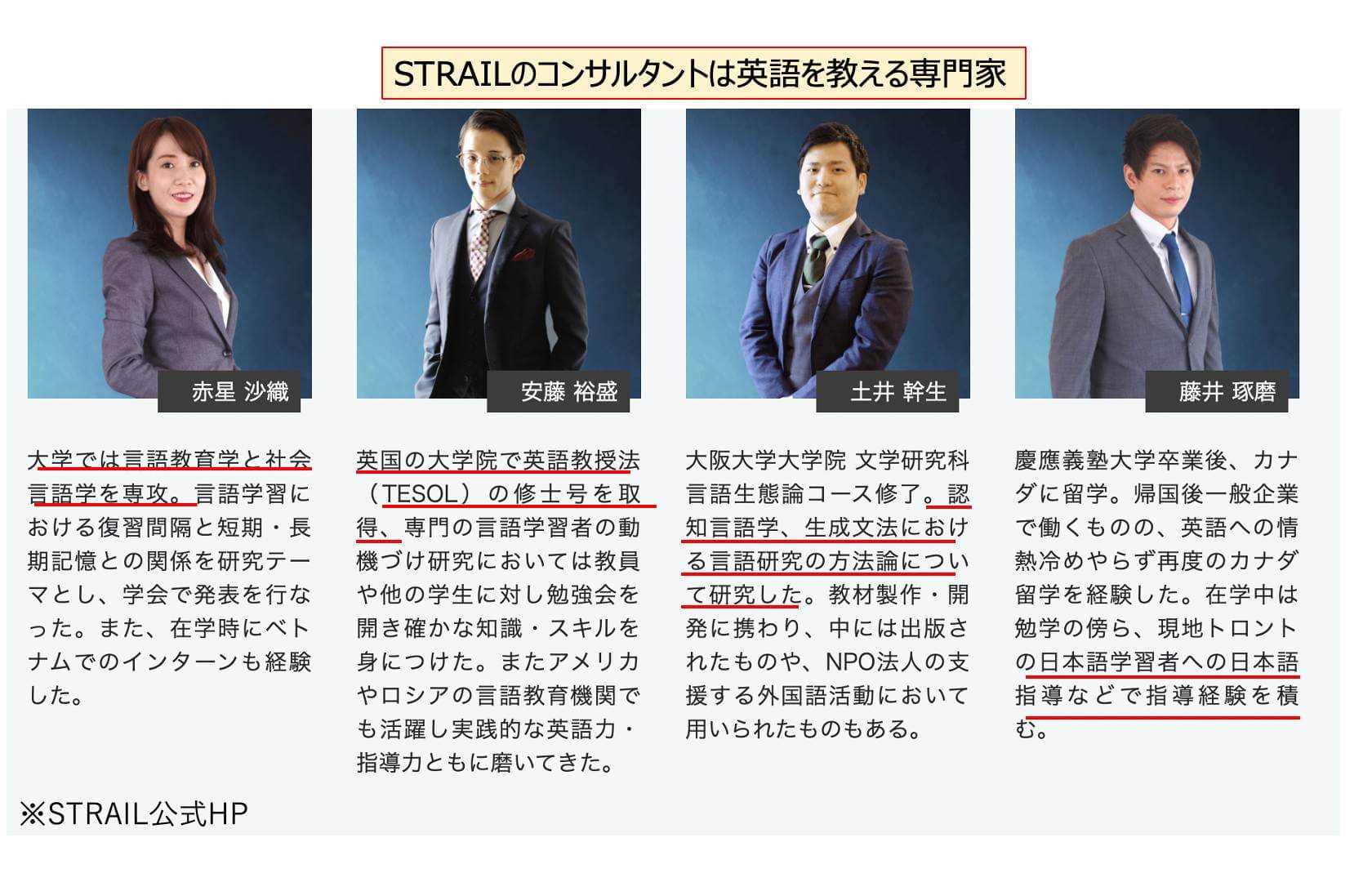 | STRAIL | 週1回 | なし (コーチングのみ) | アプリ, メール | 日本人 | 4校(東京,埼玉,大阪) | |