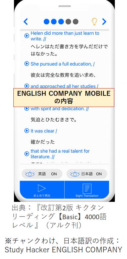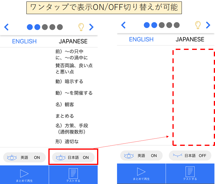 ENGLISH COMPANY MOBILEではワンタップで日本語や英語の表示ON/OFFを切り替えられます。なので、紙の教材よりも使い勝手が良いと言われることがありますね。