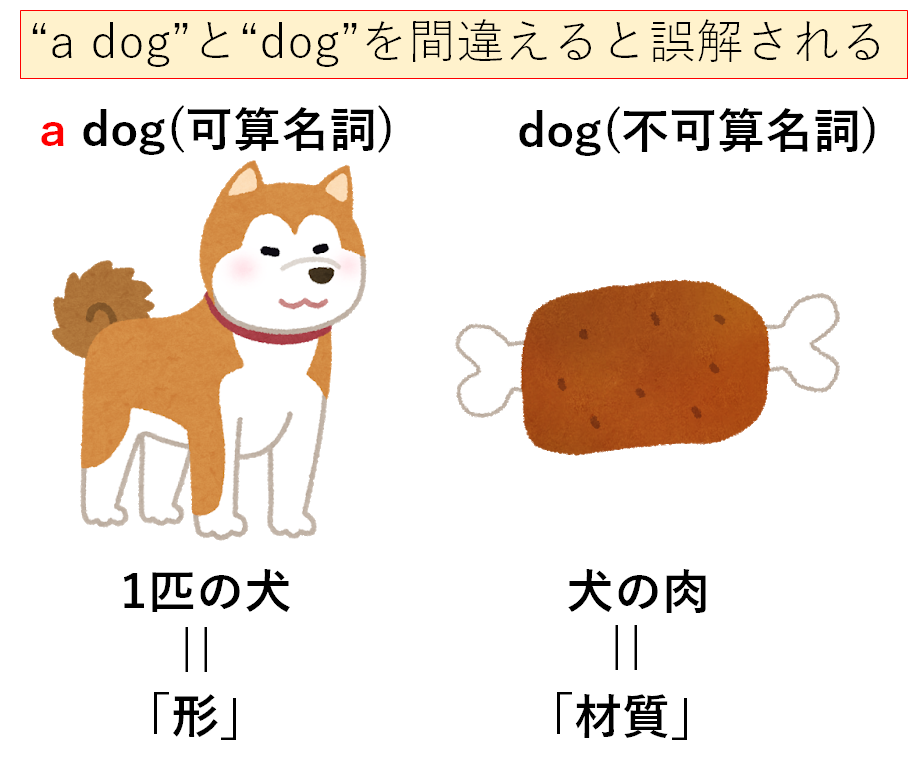 “dog”が不可算名詞として使われているので、「材質、性質」として認識していることになります。つまり、1匹の犬ではなく犬を肉片としてとらえているのだと勘違いされてしまいます。