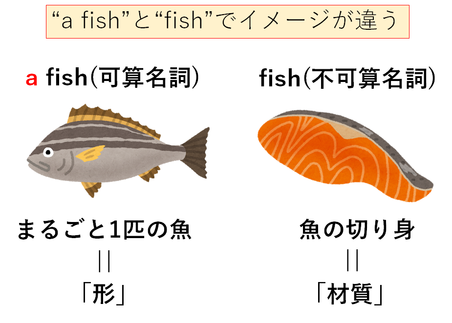可算名詞は「形」で認識するものでしたよね。なので、“a fish”と言うときは、「頭からしっぽまでそろった1匹の魚」をイメージします。