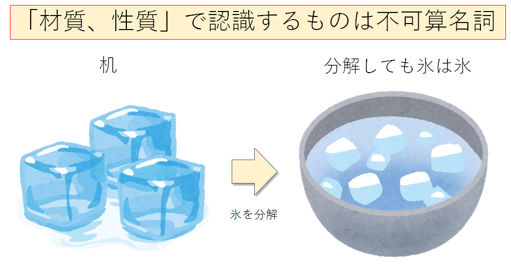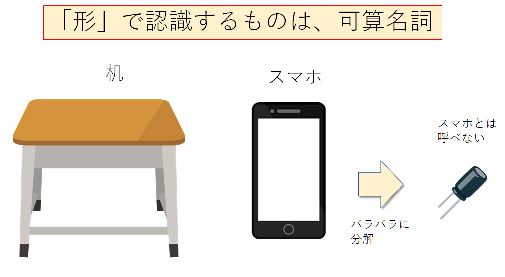 このように、人間はモノを「形」か「材質、性質」で捉えています。この捉え方の違いが可算名詞、不可算名詞と関係しています。