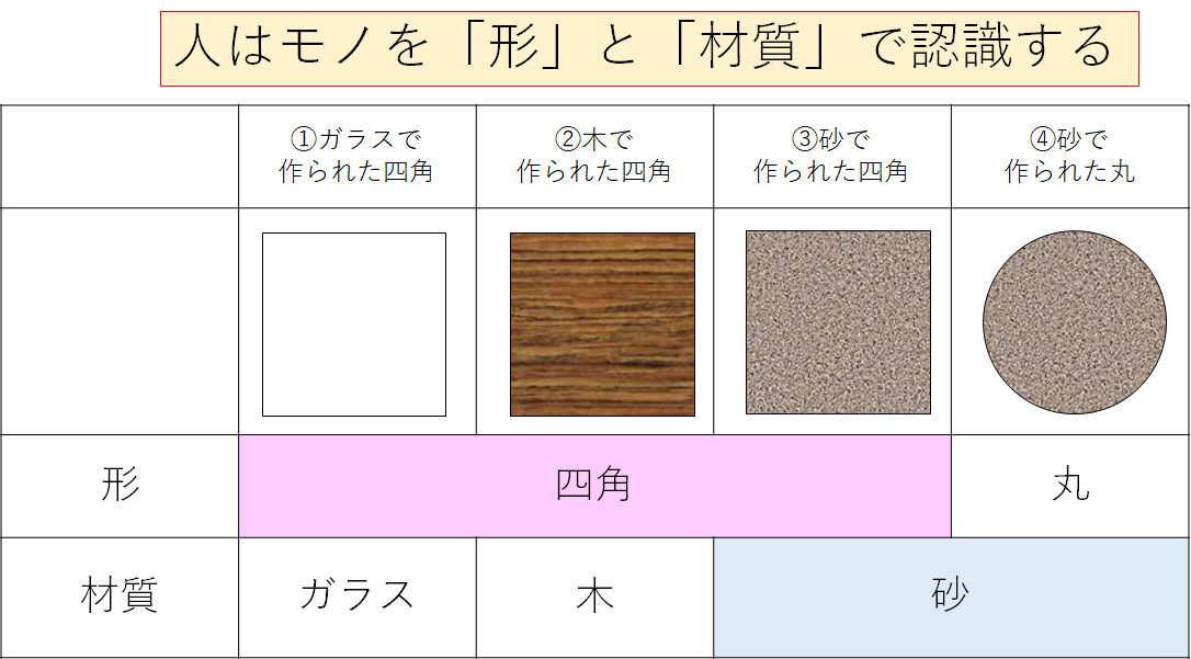 そもそも、人間はモノを「形」か「材質、性質」で捉えています。
