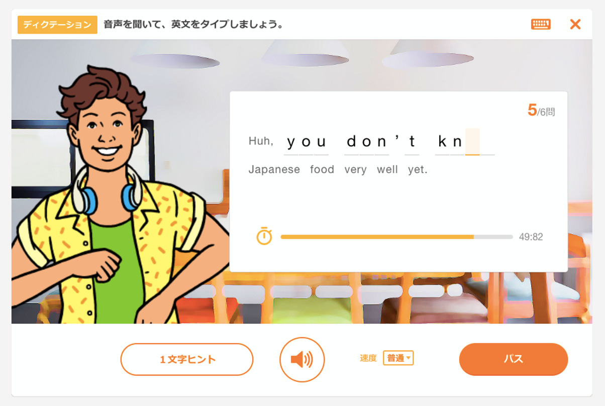 ストーリー仕立てのレッスンで総合的な学習ができるように設計されており、その中にセリフのディクテーションが含まれています。