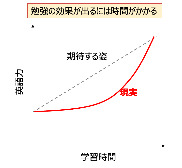 「本気で英語を話したい人が意識すべきポイント」の3つ目としてお伝えしたとおり、英語上達にはある程度の時間がかかります。