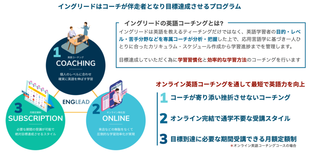 ENGLEAD(イングリード)は2020年にサービスを開始した、比較的新しい英語コーチングスクールで1ヶ月11万円から受講できます。