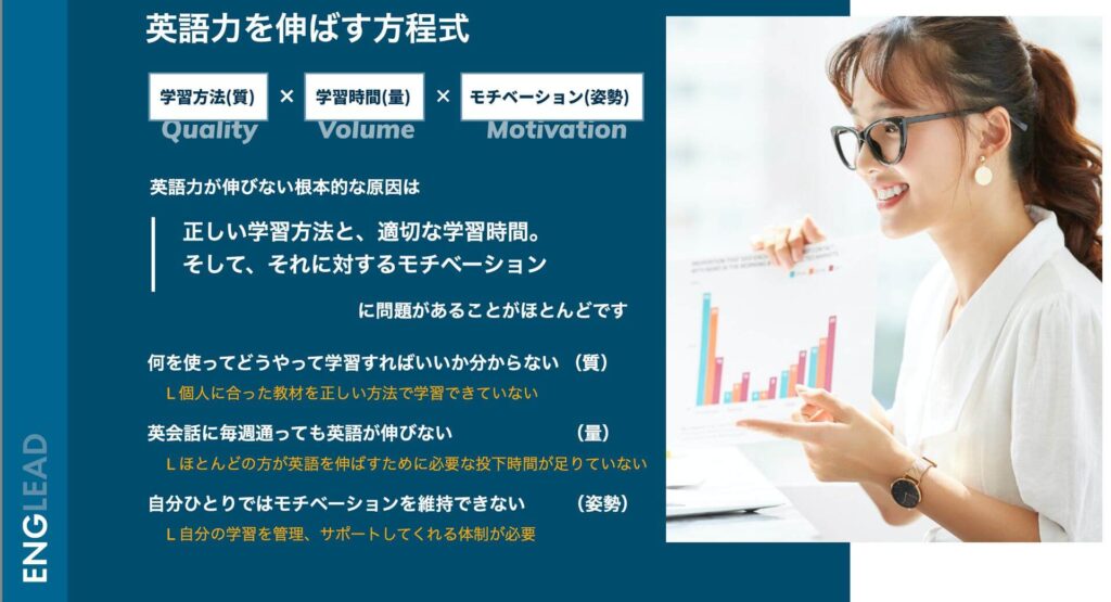 オンラインで「学習の質」、「学習の量」、「モチベーション」を最大化する英語コーチングで、留学並に英語力を伸ばせるのがイングリードというわけです。