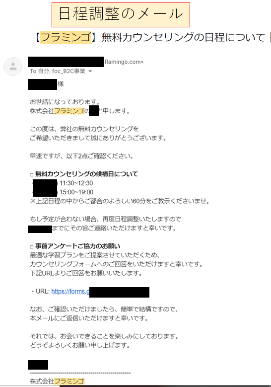 フラミンゴオンラインコーチングからの日程調整メールに、カウンセリングシートのURLが添付されています。