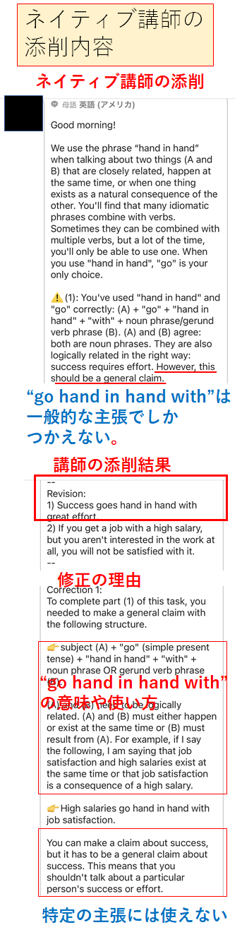 上の図を見るとわかる通り、講師から非常に詳細な添削を受けられます。単に添削をするだけでなく、“go hand in hand with”の使い方や、注意点などを具体的に押してもらえます。