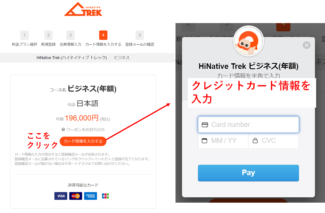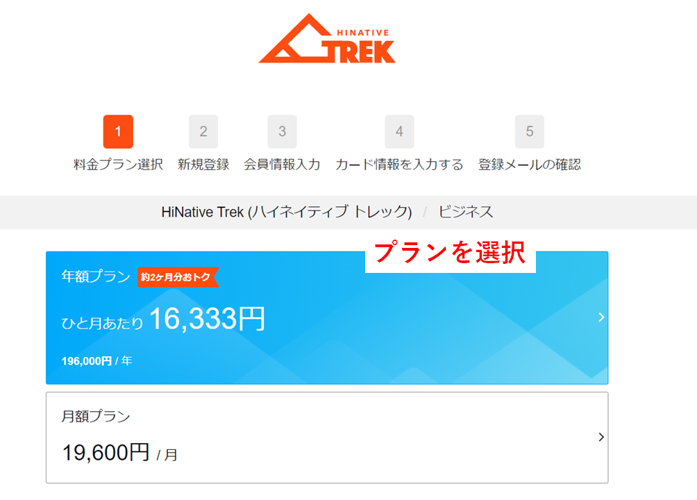 からHPにアクセスし、「HiNative Trekに登録」のボタンを押した後で、料金プランを選択します。
