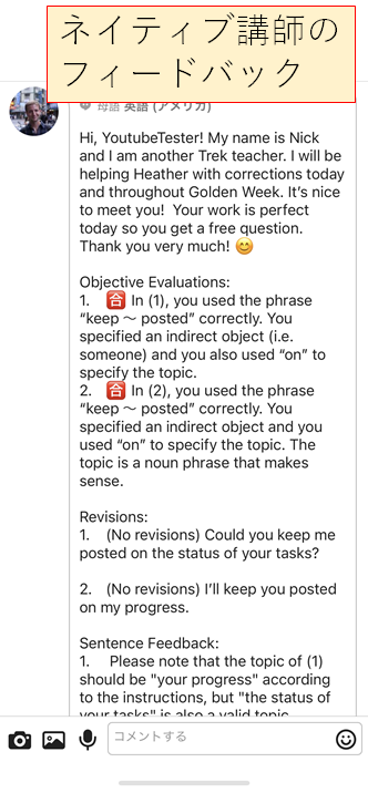 HiNativeTrekの最大の特徴は、提出した課題に対するネイティブ講師からの超丁寧なフィードバックです。自分でアウトプットした英文を元に添削をしてくれ、直した理由も丁寧に解説してくれるので、記憶に残りやすくなります。