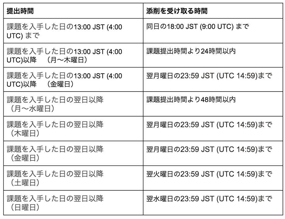課題が配信された日の13時までに提出すれば、同じ日の18時までに添削を受け取れます。13時を過ぎると、翌日の回答になります。