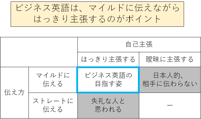 以下の図のイメージの通りで、丁寧でマイルドな表現を使いながら、はっきり自己主張するのがビジネス英語のポイントです。