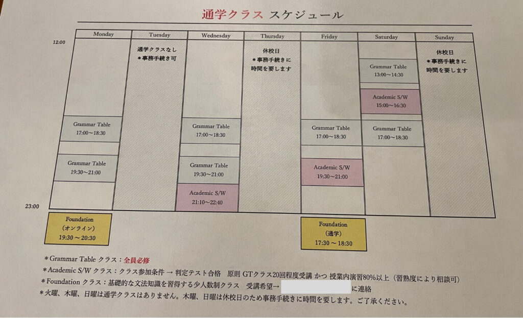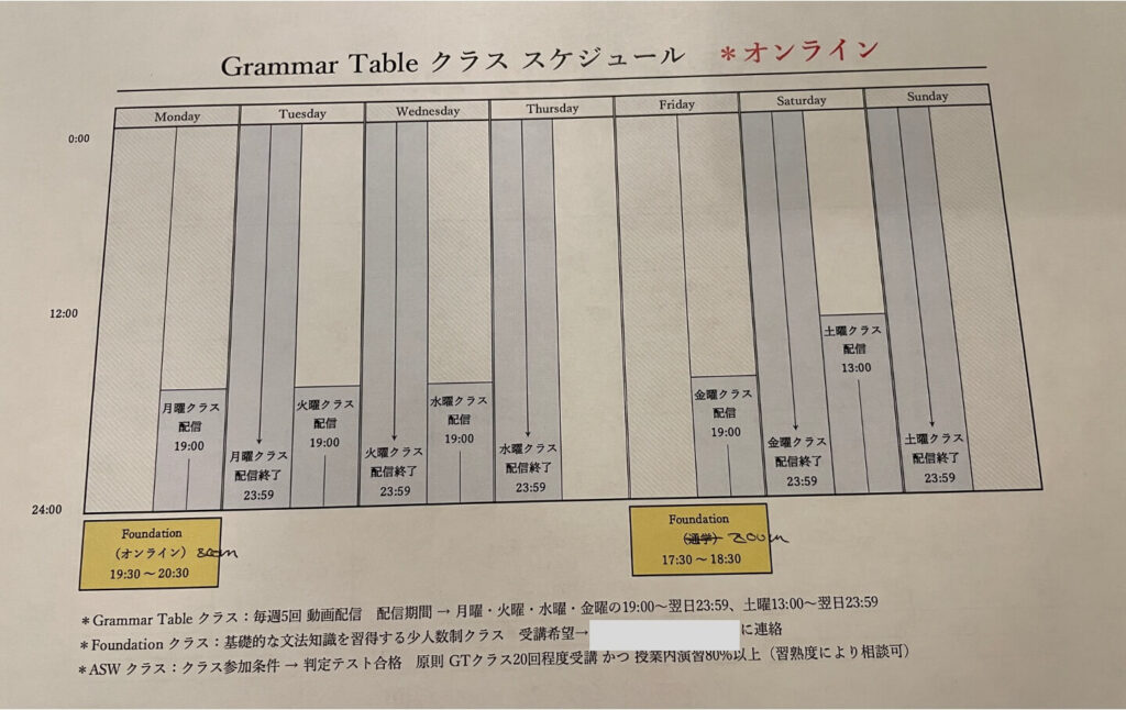 グラマーテーブルのレッスン時間割は以下の通りです。