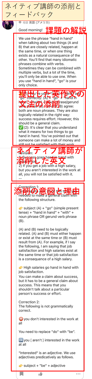 もちろん教材も優れていますが、HiNative Trekの最大の特徴は、ネイティブ講師のフィードバックが超丁寧なことです。提出した英作文に対し、「ネイティブはこういう表現は使わない」、「こういう言い方にすると、ネイティブらしくなる」などのフィードバックを受けられるので、自然とネイティブが使う表現が身につきます。