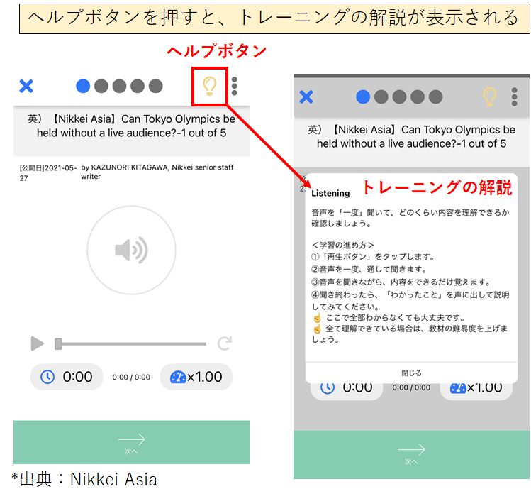 この記事で紹介したサイト・トランスレーションやシャドーイングに加え、音読や単語学習にも取り組めます。ヘルプボタンの解説が充実しているので、初心者でも具体的なトレーニングのやり方に迷いません。