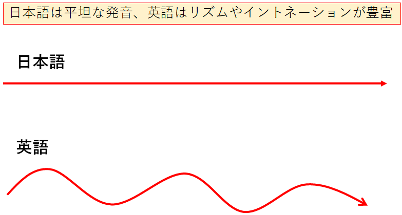 下の図は、日本語と英語のリズムをイメージで表したものです。日本語は音の高低や強弱が少なく平坦ですが、英語はアップダウンがありリズムが豊富です。