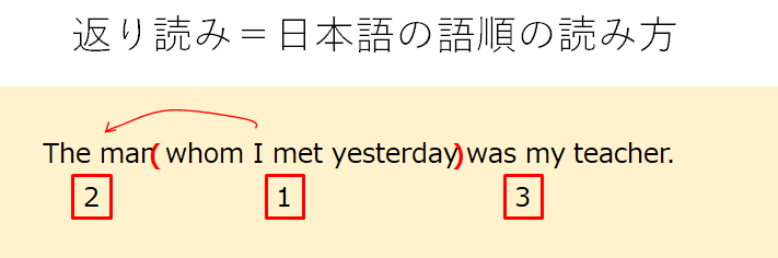 このように、日本語の語順で英語を読む読み方を「返り読み」と呼びます。