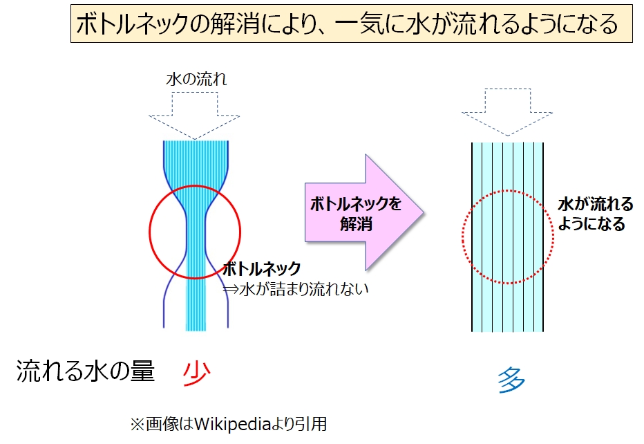 下の図をみてください。管が細くなっている場所で水の流れが悪くなっている様子を表しています。この管が細い箇所を「ボトルネック」と呼びます。ボトルネックの箇所を広げれば一気に水が流れるようになります。