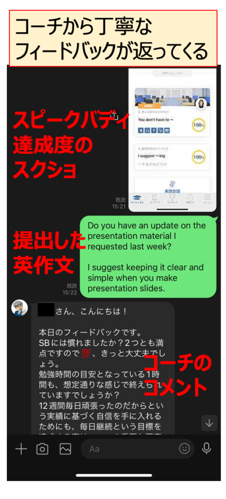 毎日の課題をLINEで提出すると、コーチから丁寧にフィードバックが返ってきます。このコメントを読むと、英語の学びになるのはもちろん、「コーチがついていてくれるから、明日もまた頑張ろう!」と思えます。