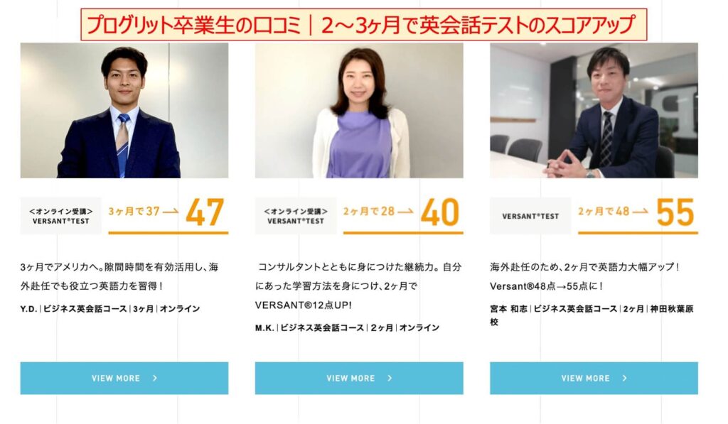 たとえば、筆者が実際に受講した「プログリット」という次世代型のオンライン英会話の卒業生は2〜3ヶ月の短期間で英会話力を飛躍的に伸ばしています。
