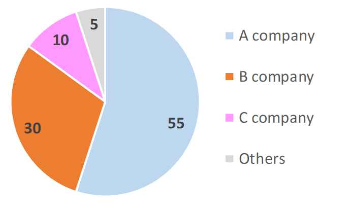 たとえば、自社と競合のシェアを紹介するときは、スライドに数字を並べるより円グラフ(pie chart)を書いた方が、パッと見てわかりやすいです。
