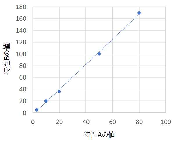 あるいは、特性Aと特性Bの相関関係を示したいときは散布図のグラフを示します。