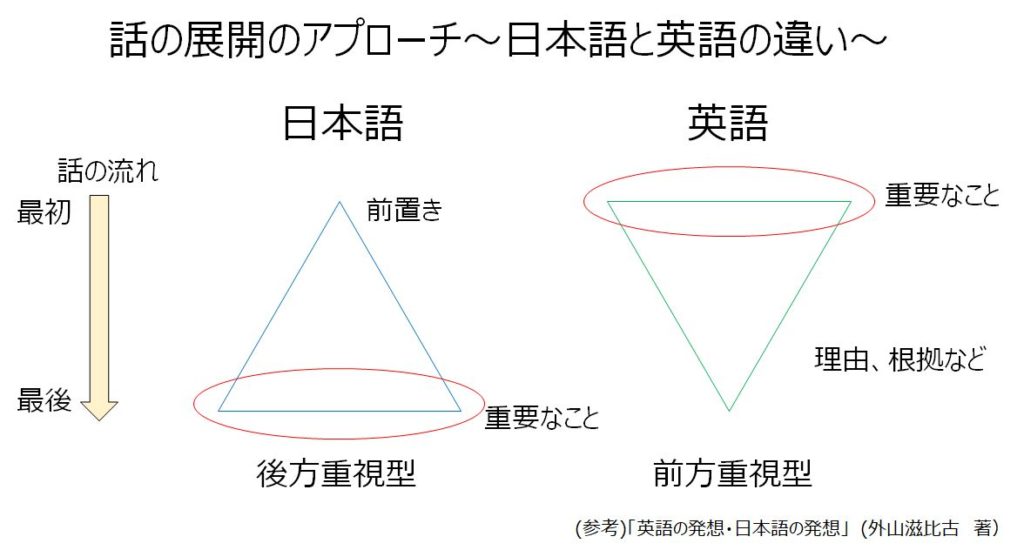 一方、英語は最初に結論を述べ、そのあとに理由や根拠を示す話し方をします。