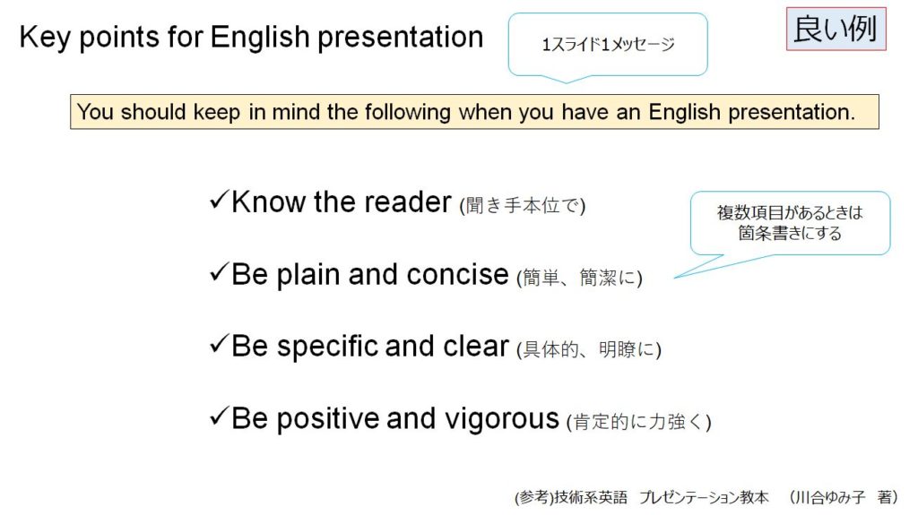 この違いを認識し、英語プレゼンのスライドは結論を先に述べ、その後に理由や根拠を述べるスタイルにするとよいでしょう。