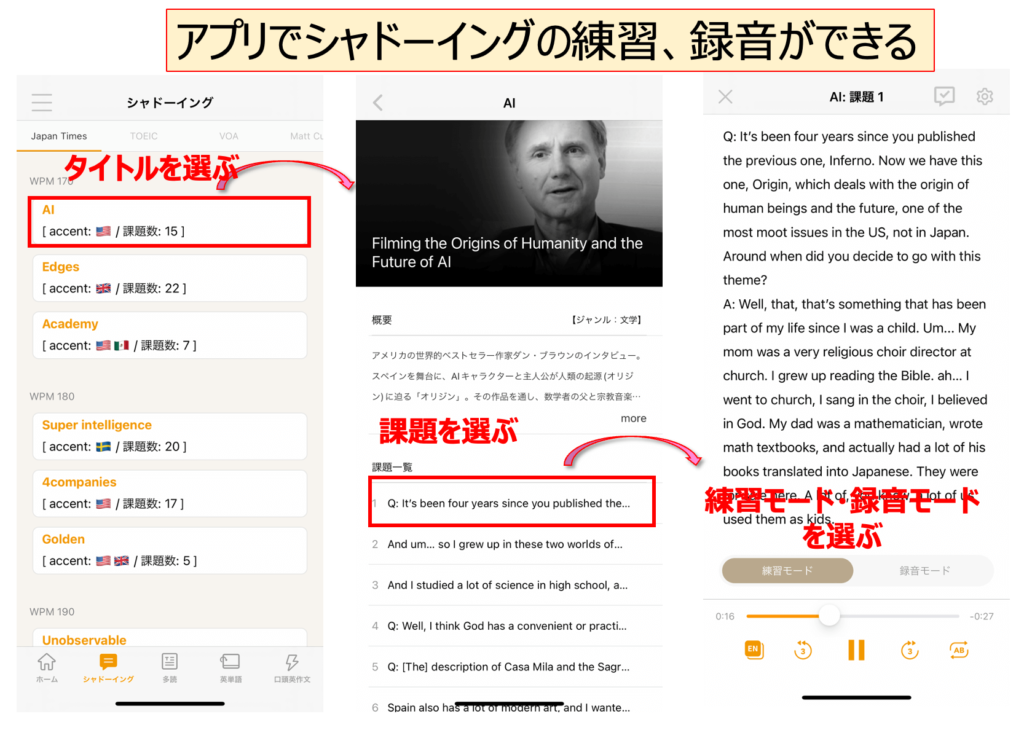 - シャドーイング:アプリで音声、スクリプト、録音まで完了
