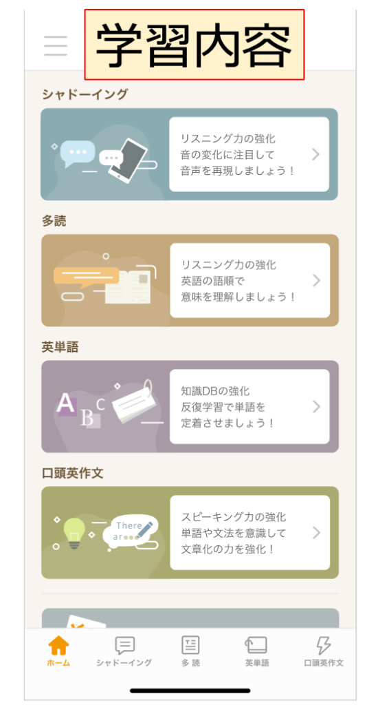 筆者が受講したときはシャドーイング、口頭英作文などトレーニングごとに教材の準備が必要でしたが、アプリ一つで学習を進められます。