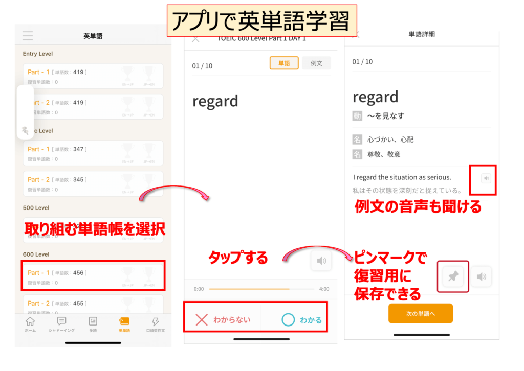 ただ、書籍の単語帳を使うと音声CDで取り込む必要があり手間がかかるります。アプリの単語帳で学習するのがベストです。