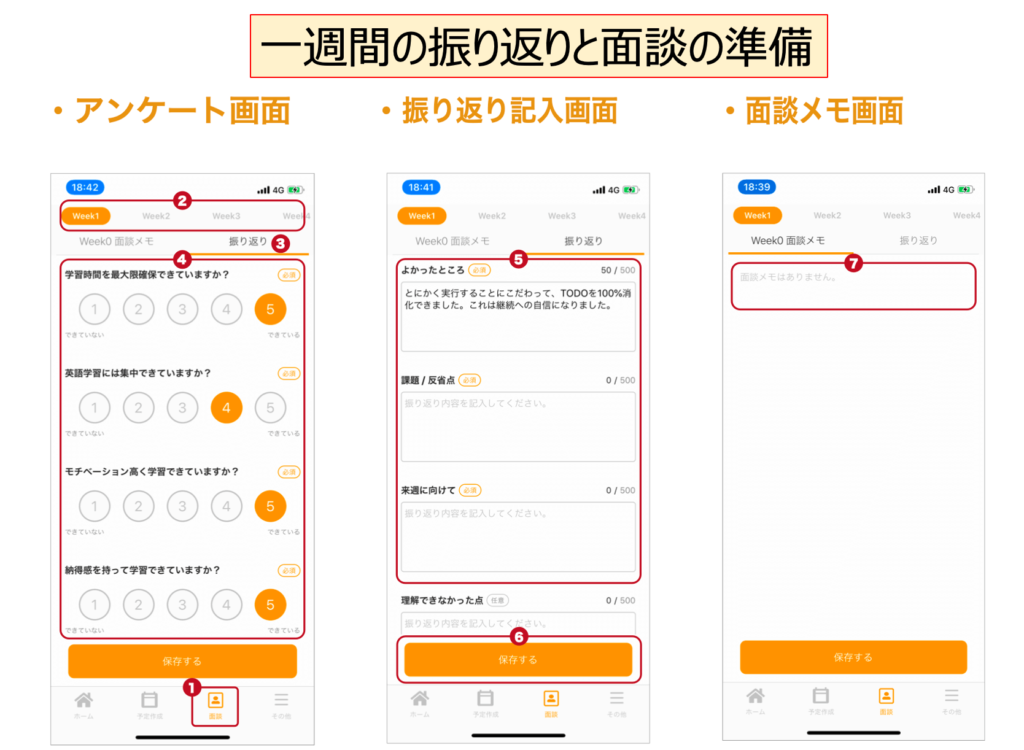 面談の前に一週間の学習を振り返りコンサルタントと共有します。効率的に面談を行うためです。