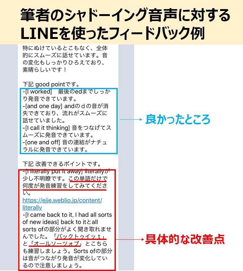 コンサルタントが、この音声を聞き毎日添削をしてくれます。このフィードバックを翌日のシャドーイングの練習に活かしました。